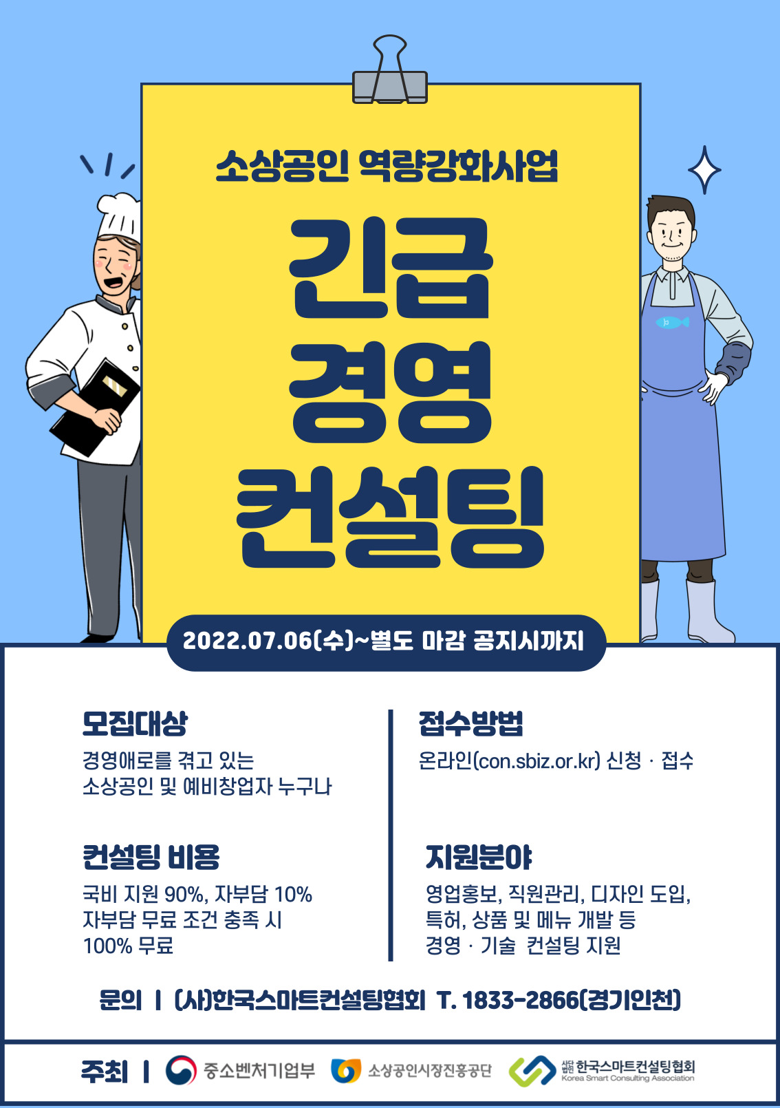 ![]() 2022³â ¼Ò»ó°øÀÎ ¿ª·®°È Áö¿ø»ç¾÷ Áß¼Òº¥Ã³±â¾÷ºÎ¿Í ¼Ò»ó°øÀνÃÀåÁøÈï°ø´Ü¿¡¼´Â ±Þº¯ÇÏ´Â °æ¿µÈ¯°æ ¼Ó¿¡ ¼Ò»ó°øÀÎÀÇ ¾ÈÁ¤Àû ¿µ¾÷±â¹Ý È®º¸¿Í ÀÚ»ý·Â Á¦°í¸¦ À§ÇØ ´ÙÀ½°ú °°ÀÌ '2022³â »ó¹Ý±â ¼Ò»ó°øÀÎ ¿ª·®°È»ç¾÷'À» ½ÃÇàÇÏ¿À´Ï, °ü½É ÀÖ´Â ºÐµéÀÇ ¸¹Àº Âü¿© ¹Ù¶ø´Ï´Ù. 2022³â 3¿ù 23ÀÏ ¼Ò»ó°øÀνÃÀåÁøÈï°ø´Ü ÀÌ»çÀå Áö¿ø´ë»ó : ¼Ò»ó°øÀÎ ¶Ç´Â ¿¹ºñâ¾÷ÀÚ * Áö¿øÁ¦¿Ü : ¼Ò»ó°øÀÎÁ¤Ã¥ÀÚ±Ý Áö¿øÁ¦¿Ü ¾÷Á¾, »çÄ¡Çâ¶ôÀû ¼Òºñ¡¤Åõ±â Á¶Àå ¾÷Á¾ µî Áö¿ø³»¿ë [±ä±Þ °æ¿µ ÄÁ¼³ÆÃ] (Áö¿ø³»¿ë) Àü¹® ÀηÂ(ÄÁ¼³ÅÏÆ®)À» Ȱ¿ëÇÑ ¡®¸ÂÃãÇü ÄÁ¼³ÆÃ¡¯ Á¦°ø Áö¿ø¾÷Á¾ À½½Ä¾÷, µµ¼Ò¸Å, ¼ºñ½º, ±âŸ Áö¿øºÐ¾ß °æ¿µºÐ¾ß: ¸¶ÄÉÆÃ, ¿µ¾÷È«º¸, ÇÁ·£Â÷ÀÌÁî, Á÷¿ø°ü¸®,À繫°ü¸®, ¾ÈÀü¡¤º¸°Ç °ü¸® µî Áö¿øÈ½¼ö µ¿ÀÏ ½ÅûÀÎ ¿¬ 1ȸ¿¡ ÇÑÇØ Áö¿ø Áö¿øÀýÂ÷ = ¼Ò»ó°øÀÎÄÁ¼³ÆÃ Á¢¼Ó(https://www.sbiz.or.kr/cot/main.do) = ¼Ò»ó°øÀÎÄÁ¼³ÆÃŬ¸¯ (»ó´Ü¸Þ´º) = ³ªÀÇÄÁ¼³ÆÃ½ÅûÇϱâ Ŭ¸¯ (¿ÞÁ·¸Þ´º) = ¿ª·®°È ½ÅûÇϱâ = ¾÷Á¾¼±Åà (¼³¹®Âü¿©) = ½Åû¼ ÀÛ¼º = ½Åû³»¿ë(±ä±Þ°æ¿µÄÁ¼³ÆÃ, Àںδ㹫·á ¼±ÅÃ) ÄÁ¼³ÆÃ³»¿ë(°æ¿µ¼±ÅÃ) === ÷ºÎÀÚ·á === »ç¾÷ÀÚµî·ÏÁõ, ¼Ò»ó°øÀÎÈ®Àμ, ºÎ°¡°¡Ä¡¼¼Ç¥ÁØ Áõ¸í ¼Ò»ó°øÀÎÈ®Àμ¹ß±Þ ¹æ¹ý (https://www.sbiz.or.kr/cose/main.do) = °æ±â¼Ò»ó°øÀ맫º ±è¹üűâÀÚ