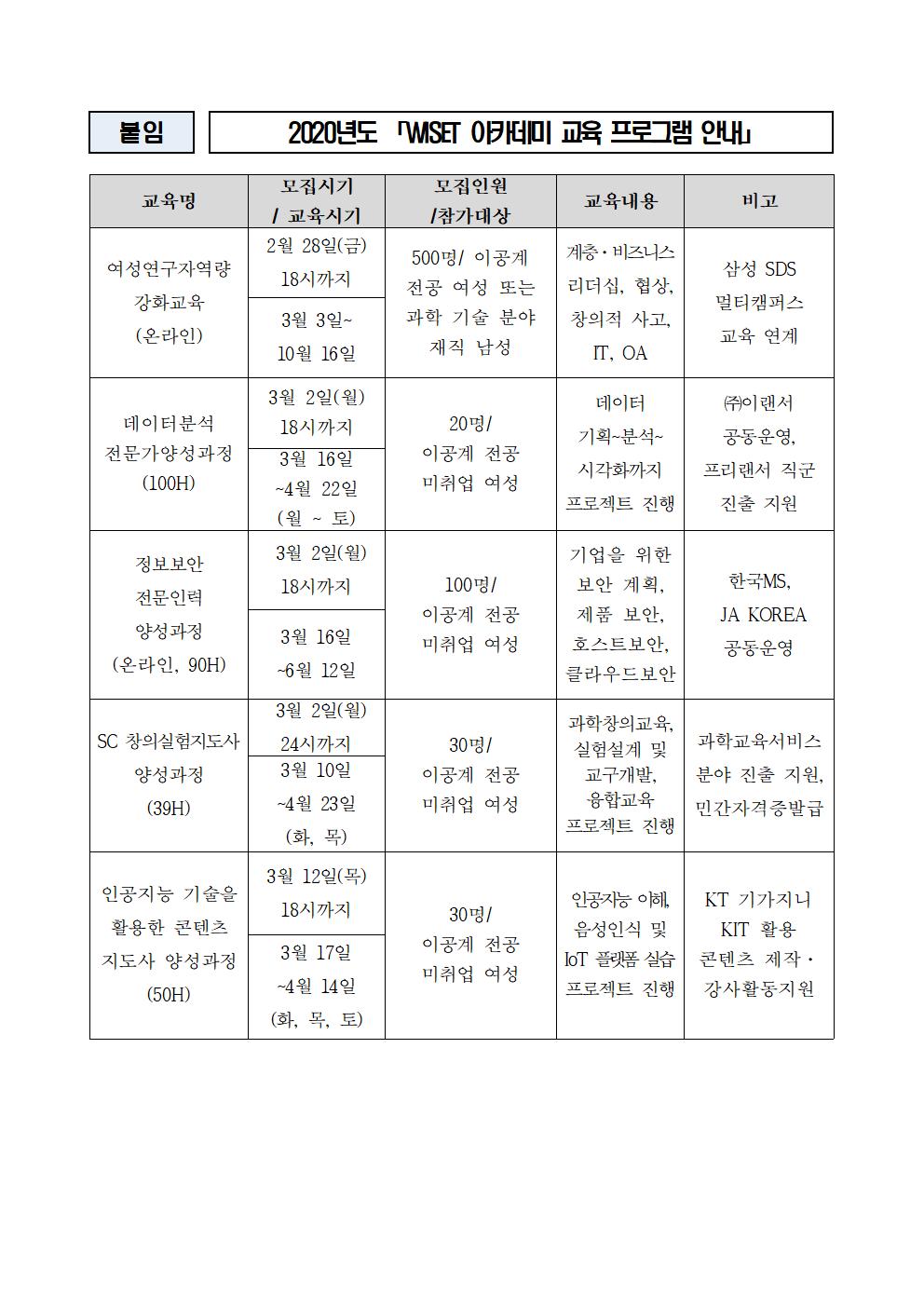 Çѱ¹¿©¼º°úÇбâ¼úÀÎÁö¿ø¼¾ÅÍ(¼ÒÀå ¾ÈÇý¿¬, ÀÌÇÏ WISET)´Â ½Å»ê¾÷, ½Å±â¼ú ºÐ¾ß ¿©¼º ÀÏÀÚ¸® ÁøÃâÀ» Áö¿øÇϱâ À§ÇØ ¿ÃÇØ ½Å±Ô ±³À°À» ´Ù¾çÇÑ ¿ÜºÎ Àü¹®±â°ü°ú Çù·ÂÇÏ¿© ÁøÇàÇÑ´Ù°í ¹àÇû´Ù.½Å»ê¾÷, ½Å±â¼úºÐ¾ß·Î½á ..